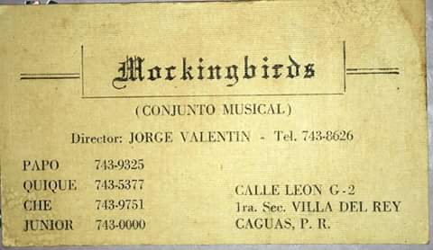 Message received from: Jose (Kike) Santiago (Alfa Rock) 'Puerto Rico Rock and Roll Hall of Fame' Inductee 2015 The Mockingbirds Saludos Erika: Te escribe Kike Santiago , baterista de un grupo muy reconocido en PR llamado Los Mockingbirds. Un grupo que nació en la Urbanizacion de Villa del Rey 1 Secc. en Caguas a mediados de los años 60. Sus miembros originales: Junior El Gordo - primera guitarra Jose Ramón Hernandez - segunda guitarra Marcelino Gomez (Perico) - bajo Kike Santiago - bateria Vocales - Jorge Valentín - Lead singer Originalmente este grupo se llamó los Krushers con su baterista Charlie Sierra (qep), Cucho y Chemon Hernandez en las guitarras. (1ra. y 2da. guitarras), Richard Valentine y Jorge Valentine, cantantes, Marcelino Gomez en el bajo. Luego el grupo sufrió una baja al salir su baterista y entró a la banda un nuevo baterista llamado Cheo, y la banda se incorporó nuevamente pero al cabo de un tiempo este último sufrió un accidente en motora donde perdió su vida y la banda sufrio una baja. A mediados de los 60 se reincorpora el grupo con nuevos integrantes y nuevo nombre. Esta vez surgieron The Mockingbirds.con sus integrantes: Junior Colon (El Gordo) - primera guitarra Juan Alfonso (Cucho) Hernandez - 2da guitarra (qpd) Marcelino Gomez (Perico) - bajo (qpd) Kike Santiago - bateria. Este último trabajó en las emisoras Alfa Rock 106 en PR como locutor, animador y en el depto. de ventas de esta emisora. Como productor de espectáculos de Rock & Roll y espectáculos playa en PR, tales como - Rincón 83 donde tocaron bandas de rock famosas de la época. Luego la segunda guitarra Juan Alfonso (Cucho) Hernandez (qpd) salió para ir al servicio militar obligatorio y lo sustituye Chemon Hernandez, su hermano, continuando la quimica rockera espectacular y musical del grupo rock, Los Mockingbirds. Sus interpretaciones Covers, de los grupos Los Birds, Los Animals, Paul Revere & the Raiders y su mayor contexto musical....toda la musica de los Beatles, los llevaron a la cúspide. Fama que obtuvieron lo que los llevó a compartir tarima en clubes tales como La Rue, de don Roberto Vargas, junto al grupo que los apoyó siempre....Los Carpetbaggers, Los Challengers, Bandolero, Teen Sounds, Los Sonset en la discoteca The Trip en Puerta de Tierra en el Jet Set del Viejo San Juan, Hotel el Conquistador, The Dungeon Discoteque en Caguas y muchas otras tarimas y eventos grandes del rock en la isla. The Mockingbirds llegó al éxito de la fama en los años 1965-1970. El historiador municipal de Caguas, Juan David Hernandez citó a los Mockingbirds en su columna del periódico regional La Semana en Caguas como parte de la cultura histórica y musical de esta region y su aportación cultural a la misma. |