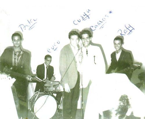 Solo unas notas para abundar sobre el historial de “Los Sunsets” o “Los Sonsets”. Fui cofundador y cantante del grupo “The Bonets” en los años 1962 al 1964, grupo del cual la Batería era José González (Cuco, Sí, el de los Sonsets). Los demás integrantes lo eran Rafy, Cusin, Paquito y este servidor. Mucho antes que Los Challengers, fuimos de los primeros grupos en PR en tocar en la TV las canciones de los Beatles, Beach Boys, etc. Eramos el grupo que ensayaba en los altos de la esquina de las calles Lima y Buenos Aires, detrás del Pocito Dulce en Barrio Obrero (Residencia de Cuco, su madre, Rafy su hermano y Miguel, su Tío). Les incluyo una foto nuestra donde claramente, verán a Cuco en la batería. Creo que cuando se hable de los grupos de Rock en PR, Los Bonets tenemos nuestro espacio. Gracias, Carlos J. Nieves |