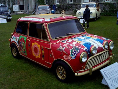 In1966 manager Brian Epstein gave each of the Beatles members a MINI Cooper S as a gift, which George Harrison subsequently painted with psychedelic images decorated by The Fool. The story is that after LSD was unknowingly slipped into their tea by a “friend”, George and John Lennon drove very slowly because they did not know what was happening to them. Shortly after the MINI was used in the film “Magical Mystery Tour”, it was given to Eric Clapton who gave it back to Harrison in the 1970′s. |